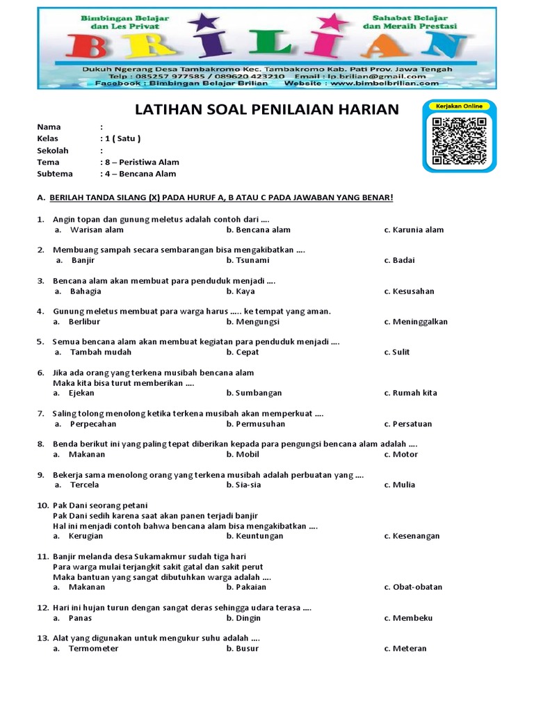 Tema 8 untuk kelas 1 SD membawa siswa dalam petualangan mengenal lingkungan sekitar, khususnya peristiwa alam. Subtema 2, yang berfokus pada "Kemarau," merupakan kesempatan emas untuk memperkenalkan konsep-konsep penting yang relevan dengan kehidupan sehari-hari. Namun, pemahaman materi ini bisa menjadi tantangan bagi sebagian siswa. Di sinilah peran penting bimbingan belajar (bimbel) hadir, khususnya Bimbel Brilian, yang dirancang khusus untuk membantu siswa kelas 1 SD memahami subtema 2 tema 8 secara mendalam dan menyenangkan.