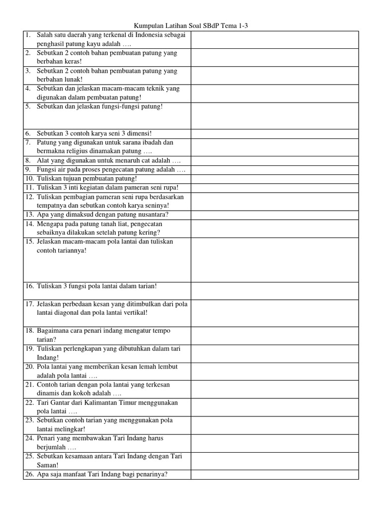 Evaluasi pemahaman siswa dalam SBDP Tematik K13 Kelas 1 perlu dilakukan secara cermat. Soal-soal yang diberikan harus mampu mengukur tidak hanya pengetahuan teoritis, tetapi juga keterampilan praktik dan apresiasi siswa. Artikel ini hadir untuk membantu para pendidik dan orang tua dalam menyusun atau memahami contoh-contoh soal SBDP Tematik Kelas 1 K13 yang bervariasi dan relevan. Kita akan menjelajahi berbagai aspek SBDP, mulai dari seni musik, seni rupa, hingga seni tari, beserta contoh soal yang dapat digunakan.