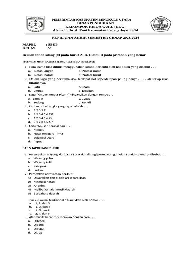 Contoh Soal SBDP Tema 1 (Seni Musik)